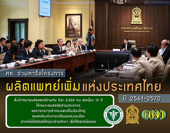 จากการหารือร่วมกันในครั้งนี้ ทุกฝ่ายเห็นพ้องให้กระทรวงศึกษาธิการและกระทรวงสาธารณสุข ตั้งเป้าหมายผลิตแพทย์ร่วมกัน ปีละ 3,000 คนต่อเนื่องเป็นเวลา 10 ปี ซึ่งเป้าหมายดังกล่าวเป็นไปตามผลการศึกษาวิจัย ทั้งในเรื่องของสัดส่วนของแพทย์ต่อจำนวนประชากร อยู่ที่สัดส่วน 1:1,200 และการลดการกระจุกตัวของแพทย์ในเมืองใหญ่ ตลอดจนการผลิตแพทย์ให้ตรงตามความจริงและสอดคล้องกับการเปลี่ยนแปลงของโลก โดยเตรียมที่จะบริหารจัดการงบประมาณใหม่ใน 2 ส่วน คือ ส่วนแรกเป็นงบดำเนินการในการผลิตแพทย์ 300,000 บาทต่อคนต่อปี และส่วนที่สอง เป็นงบจัดหาอุปกรณ์และครุภัณฑ์พื้นฐาน สำหรับการเรียนการสอน 2,000,000 บาทต่อคนต่อหลักสูตร โดยให้คำนึงถึงความคุ้มค่าของอุปกรณ์เครื่องมือต่าง ๆ ตามอายุการใช้งานเฉลี่ยตามมาตรฐานกลางของกรมบัญชีกลาง และมิให้ซ้ำซ้อนกับที่มีอยู่แล้ว