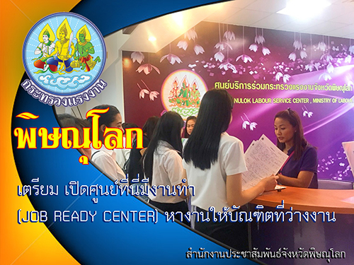 นางสายใจ แก้วรัตนากร จัดหางานจังหวัดพิษณุโลก เปิดเผยว่า หน่วยงานในสังกัดกระทรวงแรงงานจังหวัดพิษณุโลก ร่วมบูรณาการกระบวนการทำงาน เพื่อช่วยเหลือบัณฑิตที่ว่างงานและประสงค์ที่จะมีงานทำ ตามนโยบายเร่งด่วนของ พลตำรวจเอกอดุลย์ แสงสิงแก้ว รัฐมนตรีว่าการกระทรวงแรงงาน เพื่อช่วยเหลือผู้ที่จบปริญญาตรีแล้วยังไม่มีงานทำ โดยวันที่ 19 กรกฎาคม 2561 จะเปิดศูนย์ที่นี่มีงานทำ (Job Ready Center) พร้อมกันทั่วประเทศรวม 11 ศูนย์ ประกอบด้วย จังหวัดพิษณุโลก เชียงใหม่ ขอนแก่น นครราชสีมา ชลบุรี ระยอง สุราษฎร์ธานี สงขลา พระนครศรีอยุธยา ปราจีนบุรี และกรุงเทพมหานคร โดยมีกระบวนการทำงานที่สำคัญ ได้แก่