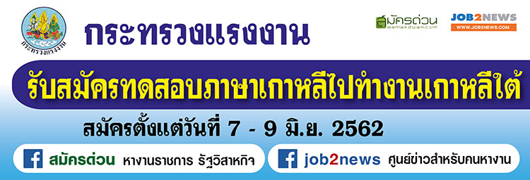 กรมการจัดหางาน กระทรวงแรงงาน เปิดรับสมัครทดสอบภาษาเกาหลีและทักษะการทำงาน (Point System) ครั้งที่ 7 เพื่อไปทำงานเกาหลีใต้ในกิจการอุตสาหกรรมการผลิต เกษตร/ปศุสัตว์ และกิจการก่อสร้าง ระหว่างวันที่ 7-9 มิถุนายน 2562 ผู้สนใจยื่นใบสมัครด้วยตนเอง ณ ศูนย์การรับสมัครจังหวัดปทุมธานี ลำปาง อุดรธานี และนครราชสีมา จัดส่งโดยรัฐ ไปทำงานอย่างถูกต้องตามกฎหมาย และไม่เสี่ยงถูกหลอกเสียเงินฟรี