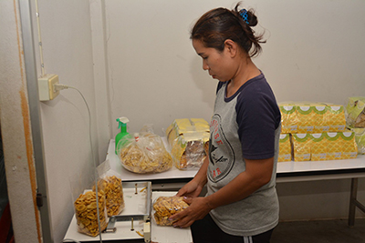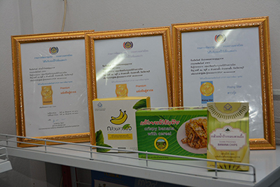 จากนั้นได้เยี่ยมชมกลุ่มกล้วยหอมทองอบสุญญากาศ เลขที่ 41 หมู่ 3 ตำบลสวนผึ้ง อำเภอสวนผึ้ง จังหวัดราชบุรี โดยกลุ่มจะรับกล้วยหอมมาจากผู้ว่าจ้าง แล้วสมาชิกในกลุ่มทำการแปรรูปให้เป็นกล้วยหอมอบสุญญากาศ แล้วนำส่งคืนให้กับผู้ว่าจ้าง ทำให้สมาชิกในกลุ่มมีรายได้เพิ่มขึ้น มีสมาชิกทั้งหมด 7 คน ได้รับการสนับสนุนจากกรมการจัดหางาน อนุมัติเงินกู้เพื่อพัฒนาต่อยอดการผลิต จำนวน 200,000 บาท ในปี 2558 ปัจจุบันผลิตสินค้าส่งขายร้านภูฟ้า สนามบินดอนเมือง และขายในชุมชน สร้างรายได้ให้สมาชิก จำนวน 6,000 บาทต่อคนต่อเดือน