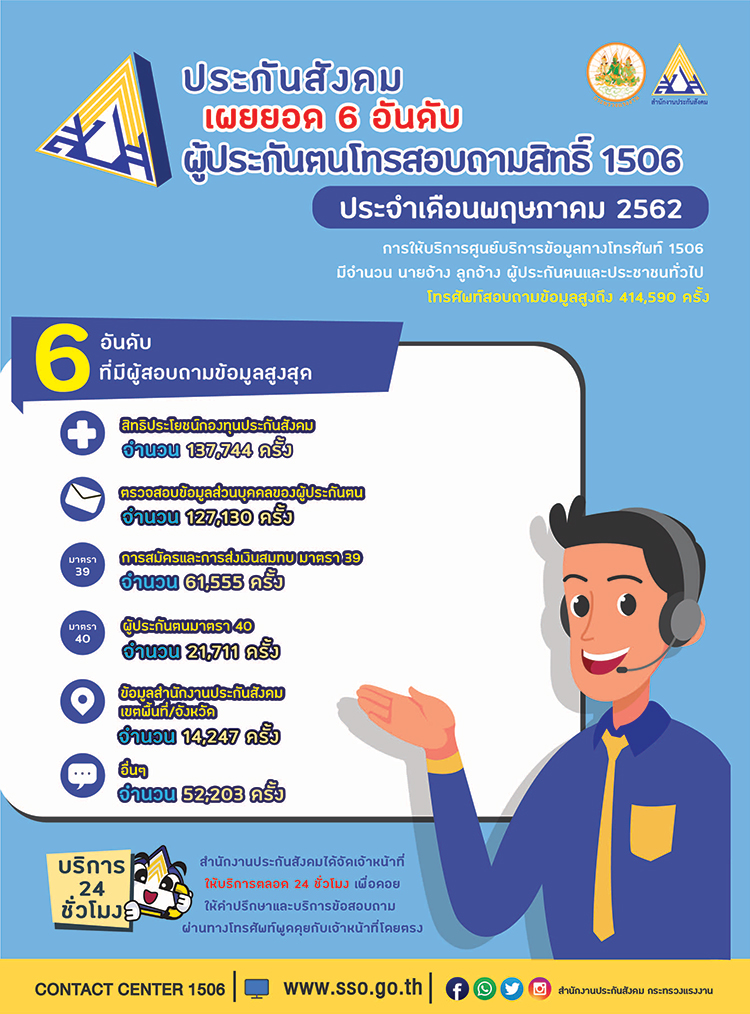 นายอนันต์ชัย อุทัยพัฒนาชีพ เลขาธิการสำนักงานประกันสังคม เปิดเผยถึง ผลการดำเนินงานการให้บริการศูนย์บริการข้อมูลประกันสังคม 1506 ในช่วงเดือนพฤษภาคม 2562 ที่ผ่านมามีจำนวนนายจ้าง ลูกจ้าง ผู้ประกันตน และประชาชนทั่วไป โทรศัพท์สอบถามข้อมูลสูงถึง 414,590 ครั้ง ได้แก่