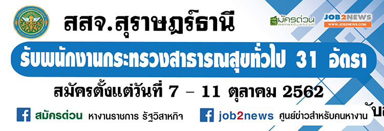 ประกาศสำนักงานสาธารณสุขจังหวัดสุราษฎร์ธานี เรื่้อง รับสมัครบุคคลเพื่อสรรหาและเลือกสรรเป็นพนักงานกระทรวงสาธารณสุขทั่วไป โดยมีรายละเอียดดังต่อไปนี้