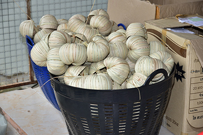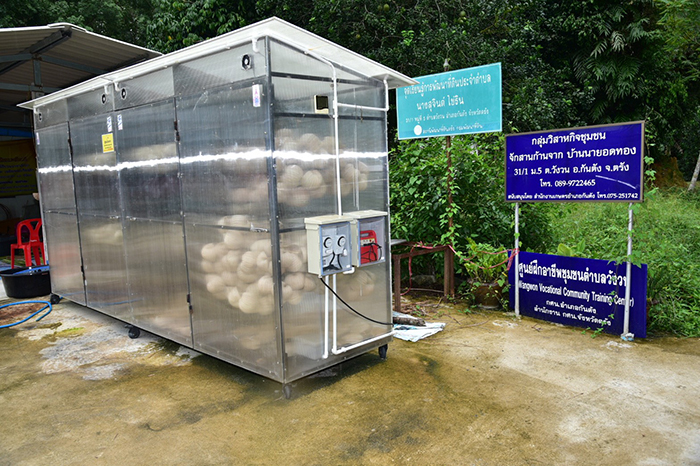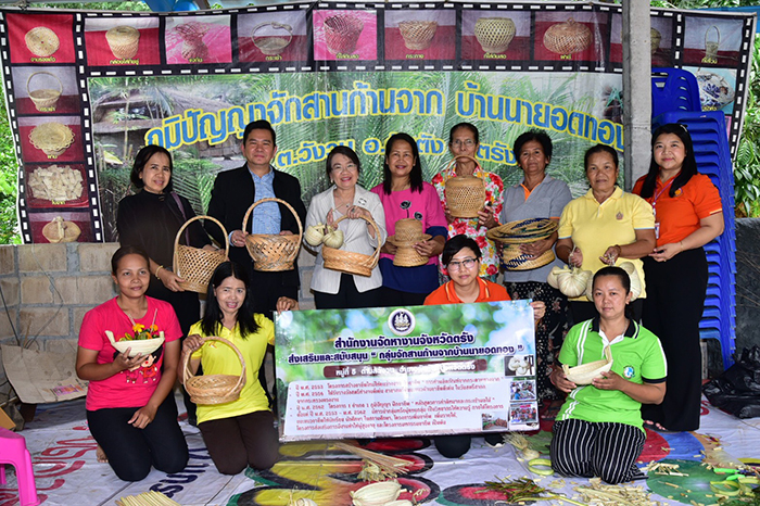 โดยนางเธียรรัตน์ นะวะมะวัฒน์ รองอธิบดีกรมการจัดหางาน รักษาราชการแทนอธิบดีกรมการจัดหางาน กล่าวว่า “กลุ่มจักสานก้านจาก บ้านนายอดทอง” เป็นกลุ่มที่รวมกันจักสานผลิตภัณฑ์จากก้านจาก ซึ่ง “ก้านจาก” แต่เดิมไม่ได้นำมาใช้ประโยชน์อะไร เพราะชาวบ้านมักลอกใบจากไปขายเหลือแต่ก้านจากเป็นวัสดุเหลือใช้ ต่อมาแม่บ้านที่มีอาชีพกรีดยางได้เกิดความคิดว่าหลังจากกรีดยางเสร็จในช่วงเช้าแล้ว ช่วงบ่ายมีเวลาว่างจึงได้คิดรวมกลุ่มกันสร้างอาชีพเสริม เพิ่มรายได้ให้กับตนเองและครอบครัว ด้วยการนำก้านจากที่เหลือใช้มาจักสานเป็นผลิตภัณฑ์ดีๆ จนในที่สุดเกิดเป็นผลิตภัณฑ์มากมาย อาทิ ติหมาใบจาก คือภาชนะไว้ใส่อาหาร น้ำและเครื่องดื่ม ฝาชี กระบุง ตะกร้า กระเป๋า กระทง ที่ใส่ผลไม้ เป็นต้น ทั้งนี้ ผลิตภัณฑ์จากก้านจากมีคุณภาพดี ไม่มีเชื้อรา เพราะได้รับการสนับสนุนจากกระทรวงพลังงานในการมอบตู้อบแห้งพลังงานแสงอาทิตย์ เพื่อใช้ในการอบก้านจากไม่ให้เกิดเชื้อรา นอกจากนั้น กลุ่มยังได้รับการสนับสนุนวิทยากรจากสถาบันการศึกษาคือมหาวิทยาลัยเทคโนโลยีราชมงคลศรีวิชัย วิทยาเขตตรัง มาให้ความรู้เกี่ยวกับการออกแบบผลิตภัณฑ์ให้เกิดความสวยงามหลากหลายอีกด้วย”