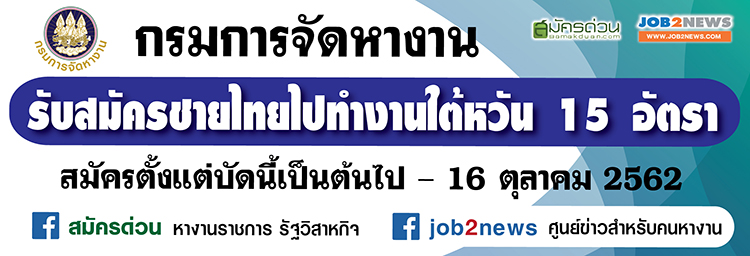 นางเธียรรัตน์ นะวะมะวัฒน์ รองอธิบดีกรมการจัดหางาน รักษาราชการแทนอธิบดีกรมการจัดหางาน แจ้งว่า กรมการจัดหางานเปิดรับสมัครพนักงานผลิตผลิตภัณฑ์สิ่งทอ เพื่อไปทำงานที่ไต้หวันกับบริษัท Kingwhale Corporation ซึ่งประกอบกิจการสิ่งทอและฟอกย้อม จำนวน 15 อัตรา เงินเดือน 23,100 เหรียญไต้หวัน หรือประมาณ 22,837.58 บาท (อัตราแลกเปลี่ยน ณ วันที่ 11 ตุลาคม 2562 : 1TWD = 0.99 บาท) คุณสมบัติ เพศชาย อายุ 20-45 ปี จบวุฒิการศึกษาตั้งแต่มัธยมศึกษาตอนต้น (ม.3) ขึ้นไป พ้นภาระการรับราชการทหาร สายตาอยู่ในระดับ 0.8-1.5 และไม่บอดสี สภาพร่างกายสมบูรณ์ ระยะเวลาจ้างงาน 3 ปี อัตราค่า ล่วงเวลาเป็นไปตามกฎหมายแรงงานไต้หวันกำหนด คนหางานรับผิดชอบค่าอาหารและที่พัก เดือนละ 2,500 เหรียญไต้หวันต่อเดือน ส่วนบริษัทรับผิดชอบค่าใช้จ่ายในประเทศไทย ได้แก่ ค่าตรวจสุขภาพ ค่าวีซ่า ค่าตรวจสอบประวัติอาชญากรรมและรับผิดชอบค่าใช้จ่ายในไต้หวัน ได้แก่ค่าใบถิ่นที่อยู่ ค่าบริการดูแลรายเดือนที่ต้องจ่ายให้แก่บริษัทจัดหางานไต้หวันตลอดจนค่าโดยสารเครื่องบินขาเข้าไต้หวันและค่าโดยสารเครื่องบินกลับประเทศไทยเมื่อทำงานครบตามสัญญาจ้าง พร้อมทั้งจัดอาหารว่างให้ฟรีช่วงทำงานล่วงเวลา ผู้สนใจเตรียมหลักฐานการสมัคร ดังนี้ 1.ใบสมัครตามแบบฟอร์ม สามารถดาวน์โหลดแบบฟอร์มใบสมัครได้เองหรือขอรับได้ ณ สถานที่รับสมัครงาน2.สำเนาบัตรประจำตัวประชาชน 3.สำเนาทะเบียนบ้าน 4.สำเนาหนังสือเดินทาง (ถ้ามี) 5.สำเนาวุฒิการศึกษา 6.หลักฐานการพ้นภาระการรับราชการทหาร 7.รูปถ่ายสี ขนาด 2 นิ้ว สมัครงานได้ด้วยตนเองพร้อมยื่นหลักฐานการสมัครได้ตั้งแต่บัดนี้จนถึงวันที่ 16 ตุลาคม 2562 ได้ที่สำนักงานจัดหางานจังหวัดทุกจังหวัด สำนักงานจัดหางานกรุงเทพมหานครพื้นที่ 1-10 หรือกองบริหารแรงงานไทยไปต่างประเทศ กรมการจัดหางาน อาคารสำนักงานประกันสังคมกรุงเทพมหานครพื้นที่ 3 ชั้น 10