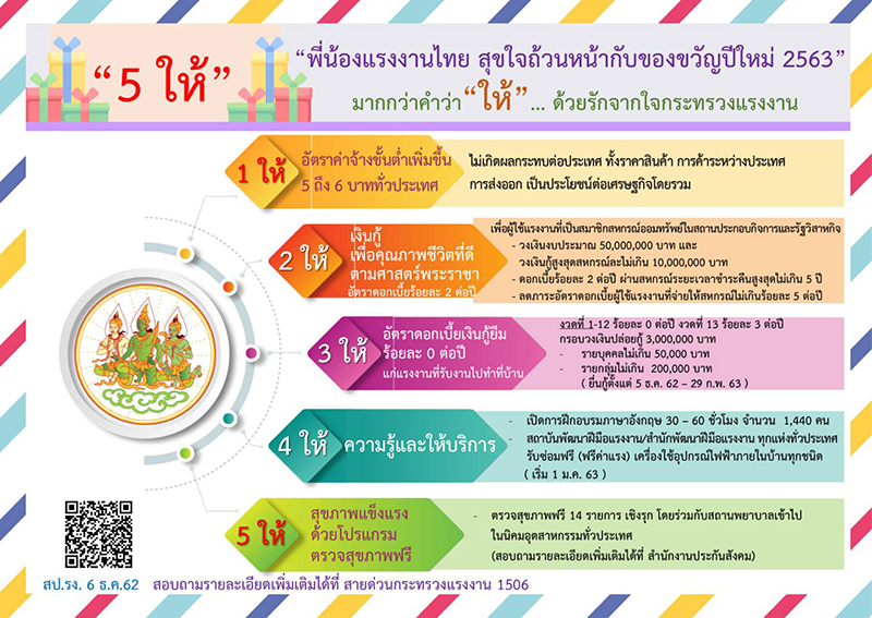 รัฐมนตรีว่าการกระทรวงแรงงาน เผย กระทรวงแรงงาน มอบของขวัญปีใหม่ 2563 พี่น้องแรงงานไทย 5 ชิ้น ภายใต้แนวคิด “สุขใจถ้วนหน้า มากกว่าคำว่า “ให้” …ด้วยรักจากใจกระทรวงแรงงาน” “5 ให้” ประกอบด้วย ให้อัตราค่าจ้างขั้นต่ำเพิ่ม 5 – 6 บาททั่วประเทศ ให้เงินกู้เพื่อคุณภาพชีวิตที่ดีตามศาสตร์พระราชา อัตราดอกเบี้ยร้อยละ 2 ต่อปี ให้เงินกู้แรงงานรับงานไปทำที่บ้านอัตราดอกเบี้ยร้อยละ 0 ต่อปี ให้ความรู้เปิดอบรมภาษาอังกฤษฟรีให้บริการซ่อมฟรีเครื่องใช้ไฟฟ้าภายในบ้าน และให้สุขภาพแข็งแรงด้วยโปรแกรมตรวจสุขภาพฟรี 14 รายการ ในนิคมอุตสาหกรรมทั่วประเทศ