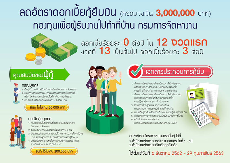 กรมการจัดหางาน สร้างสุขปีใหม่ มอบโครงการ “สร้างสุขแก่ผู้รับงานไปทำที่บ้านและชุมชน” ให้ผู้รับงานไปทำที่บ้านกู้ยืมเงินกองทุนเพื่อผู้รับงานไปทำที่บ้าน เพื่อขยายการผลิต วงเงินกู้ไม่เกิน 50,000 บาท สำหรับประเภทบุคคล และวงเงินกู้ไม่เกิน 200,000 บาท สำหรับกลุ่มบุคคล อัตราดอกเบี้ย 0% ต่อปี ตั้งแต่วันนี้ – 29 กุมภาพันธ์ 2563 ผู้สนใจติดต่อได้ที่สำนักงานจัดหางานทั่วประเทศ