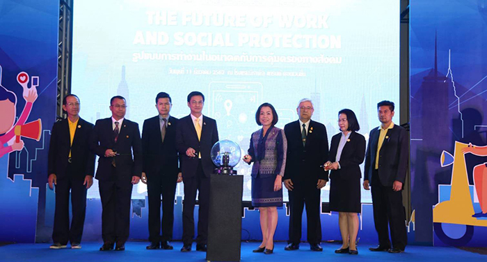 รองศาสตราจารย์จักษ์ พันธ์ชูเพชร ที่ปรึกษารัฐมนตรีว่าการกระทรวงแรงงาน กล่าวในโอกาสเป็นประธานในพิธีเปิดฯ ว่า กระทรวงแรงงานมีภารกิจสำคัญในการดูแลชีวิตความเป็นอยู่ของแรงงานให้มีความรู้ความสามารถ มีทักษะฝีมือ มีอาชีพ มีรายได้ มีความมั่นคงในการทำงานได้รับการคุ้มครองที่เสมอภาค เท่าเทียม เป็นธรรม มีความปลอดภัยในการทำงานมีสภาพแวดล้อมในการทำงานที่ดี ได้รับสวัสดิการที่เหมาะสม และมีหลักประกันทางสังคมตามยุทธศาสตร์ชาติ ๒๐ ปี (พ.ศ. ๒๕๖๑ – ๒๕๘๐) ด้านการสร้างโอกาสและความเสมอภาคทางสังคม และแผนแม่บทพัฒนาแรงงานไทยในระยะ ๕ ปี (พ.ศ. ๒๕๖๐ – ๒๕๖๔) ในประเด็นยุทธศาสตร์การคุ้มครองและเสริมสร้างความมั่นคง หลักประกันในการทำงานและคุณภาพชีวิตที่ดี ทั้งนี้ได้มอบหมายหน่วยงานในสังกัดเตรียมความพร้อมด้านกำลังคนที่สอดรับกับการเปลี่ยนแปลงของเทคโนโลยีและการผลิตยุค Thailand ๔.๐ รวมถึงการปรับปรุงและพัฒนาการดำเนินงานด้านแรงงาน ให้สอดคล้องกับบริบทความท้าทายทางเศรษฐกิจและสังคมที่เปลี่ยนแปลงไป เพื่อรองรับการเปลี่ยนแปลง ที่เกิดขึ้นของเศรษฐกิจไทยในยุคดิจิตอลที่คนทำงานผ่านระบบอัตโนมัติร่วมกับเทคโนโลยีปัญญาประดิษฐ์ ในขณะเดียวกันก็มองหาโอกาสที่จะสร้างหลักประกันทางสังคมที่ครอบคลุมถ้วนหน้าให้แก่ ผู้ใช้แรงงานทุกกลุ่ม เพื่อจะได้มีความมั่นคงในชีวิตและมีความเท่าเทียมกันระหว่างคนในสังคมตามหลักการทำงานอย่างมีคุณค่าหรือ Decent Work ซึ่งในการประชุมวิชาการประกันสังคมในวันนี้ เพื่อเปิดเวทีให้ความรู้ และความเข้าใจงานประกันสังคมแก่ประชาชนทั่วไป และแลกเปลี่ยนความคิดเห็นเกี่ยวกับมุมมองอาชีพงานรูปแบบใหม่ (Platform Workers) ที่เกิดขึ้นในปัจจุบันและอนาคต มุมมองการให้ความคุ้มครองทางสังคม และก่อให้เกิดการประสานความร่วมมือระหว่างหน่วยงานต่าง ๆ ตนจะช่วยกันให้ความคิดเห็นเกี่ยวกับแนวทางการขับเคลื่อนการพัฒนาระบบความคุ้มครองทางสังคม เพื่อเป็นข้อมูลให้สำนักงานประกันสังคม หน่วยงาน ในสังกัดกระทรวงแรงงาน และภาคส่วนที่เกี่ยวข้องนำไปประกอบการกำหนดนโยบายและแนวทาง การดำเนินงานที่เหมาะสมต่อไป