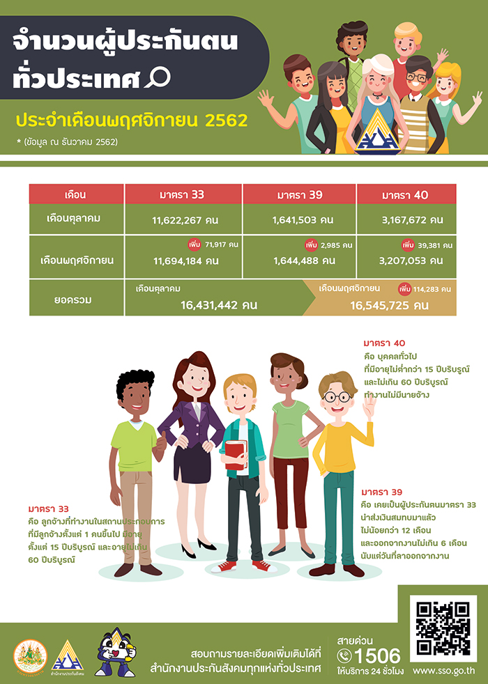 ด้านนายทศพล กฤตวงศ์วิมาน เลขาธิการสำนักงานประกันสังคม กระทรวงแรงงาน เปิดเผยว่า จากข้อมูลตัวเลขที่เพิ่มขึ้นดังกล่าว คิดแยกเป็นผู้ประกันตนมาตรา 33 (ลูกจ้างที่ทำงานในสถานประกอบการที่มีลูกจ้างตั้งแต่ 1 คนขึ้นไป) มีจำนวน 11,694,184 คน เพิ่มขึ้นถึง 71,917 คน ผู้ประกันตนภาคสมัครใจมาตรา 39 (ผู้ประกันตนที่เคยเป็นผู้ประกันตนมาตรา 33 มาก่อน นำส่งเงินสมทบมาแล้วไม่น้อยกว่า 12 เดือน และออกจากงานไม่เกิน 6 เดือนนับแต่วันที่ลาออกจากงาน) มีจำนวน 1,644,488 คน เพิ่มขึ้น 2,985 คน และแรงงานภาคอิสระหรือบุคคลทั่วไปสมัครเป็นผู้ประกันตนมาตรา 40 จำนวน 3,207,053 คน เพิ่มขึ้น 39,381 คน สำนักงานประกันสังคมจะดำเนินงานตามนโยบายของกระทรวงแรงงาน ในการพัฒนาสิทธิประโยชน์เพื่อให้คลอบคลุมทุกมิติให้กับประชาชน ผู้ใช้แรงงาน ได้รับประโยชน์สูงสุด เป็นที่พึ่ง อย่างแท้จริงต่อไป