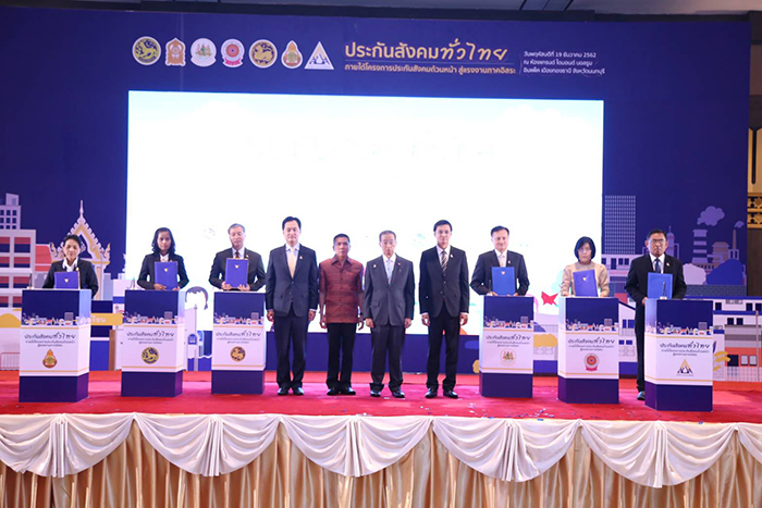 หม่อมราชวงศ์ จัตุมงคล โสณกุล รัฐมนตรีว่าการกระทรวงแรงงาน เป็นประธานเปิดงาน “ประกันสังคมทั่วไทย” ภายใต้โครงการประกันสังคมถ้วนหน้า สู่แรงงานภาคอิสระ และพิธีลงนามบันทึกความร่วมมือ “สร้างการรับรู้เพื่อยกระดับคุณภาพชีวิตของผู้ใช้แรงงาน” เพื่อร่วมบูรณาการ สนับสนุน ส่งเสริมให้เกิดการขับเคลื่อนการเข้าถึงความคุ้มครองทางสังคมของแรงงานภาคอิสระ ภายใต้แนวทางการพัฒนาการดำเนินการแบบมีส่วนร่วมของหน่วยงานที่เป็นภาคีเครือข่ายแบบ “บวร”(บ้าน วัด โรงเรียน โรงงาน) ระหว่างกระทรวงแรงงาน กระทรวงมหาดไทย กระทรวงศึกษาธิการ สำนักงานประกันสังคม กรมการปกครองสำนักงานคณะกรรมการการศึกษาขั้นพื้นฐาน และสำนักงานพระพุทธศาสนาแห่งชาติ ณ ห้องแกรนด์ ไดมอนด์บอลรูม เมืองทองธานี จังหวัดนนทบุรี ในวันที่ 19 ธันวาคม 2562 โดยรัฐมนตรีว่าการกระทรวงแรงงานได้เปิดเผยกับสื่อมวลชนว่า กระทรวงแรงงานได้ตระหนักถึงการพัฒนาศักยภาพและคุณภาพชีวิตที่ดีของประชาชนเป็นภารกิจที่สำคัญในการพัฒนาประเทศ ตามนโยบายของรัฐบาลที่มีการส่งเสริมให้ประชาชนเข้าถึงระบบความคุ้มครองทางสังคม และครอบคลุมมากยิ่งขึ้น โดยเฉพาะกลุ่มผู้ประกอบอาชีพอิสระที่เป็นแรงงานกลุ่มใหญ่ของประเทศ ซึ่งจะต้องมีหลักประกันทางสังคม อย่างไรก็ดี การสมัครเข้าสู่ระบบความคุ้มครองจากสำนักงานประกันสังคม สามารถเป็นหลักประกันความมั่นคงในชีวิตและยกระดับคุณภาพชีวิตที่ดีขึ้นได้ อีกทั้งเป็นการสนับสนุนนโยบายลดความเหลื่อมล้ำทางสังคมของรัฐบาล ซึ่งจากการสำรวจข้อมูลปี 2562 พบว่ามีแรงงานอิสระ จำนวน 21.2 ล้านคนทั่วประเทศ แต่มีเพียงร้อยละ 15 ที่เข้าถึงระบบความคุ้มครองประกันสังคมมาตรา 40 โดยแนวทางที่สำคัญ ในการขับเคลื่อนให้แรงงานอิสระได้เข้าสู่ระบบความคุ้มครองประกันสังคมเพิ่มมากขึ้น คือ การบูรณาการความร่วมมือกับหน่วยภาครัฐ ภาคเอกชน ภาคประชาสังคม และภาคประชาชนให้เข้ามามีส่วนร่วม และมีบทบาทสำคัญในการร่วมขับเคลื่อนให้แรงงานอิสระมีหลักประกันความคุ้มครองทางสังคมอย่างทั่วถึง การจัดงาน “ประกันสังคมทั่วไทย” ในวันนี้เป็นการขับเคลื่อนนโยบายการขยายความคุ้มครองประกันสังคมภาคสมัครใจ สู่แรงงานภาคอิสระ สามารถเข้าถึงสิทธิประโยชน์จากสำนักงานประกันสังคม และเป็นการสร้างความรู้ ความเข้าใจเกี่ยวกับสวัสดิการภาครัฐด้านการประกันสังคม และสร้างแรงจูงใจให้แรงงานอิสระเข้าถึงการมีหลักประกันทางสังคม และยังเป็นการพัฒนาเครือข่ายแบบมีส่วนร่วมเพื่อการขับเคลื่อนให้ประชาชนมีหลักประกันความคุ