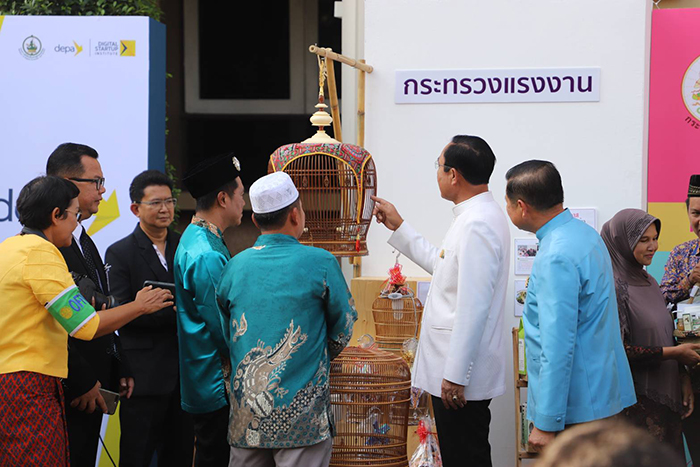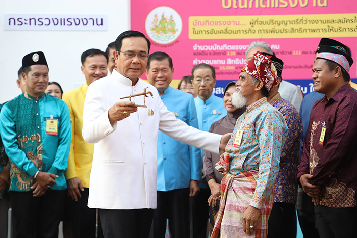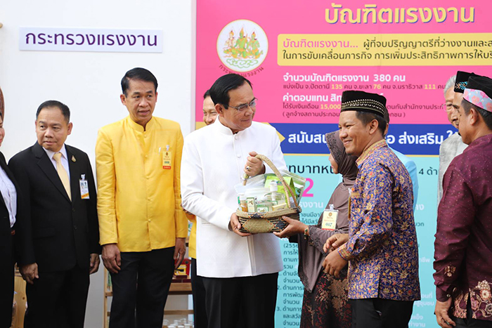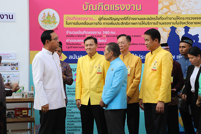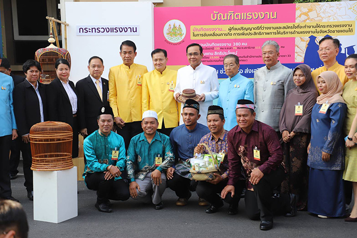 วันที่ 7 มกราคม 2563 ณ บริเวณด้านหน้าตึกบัญชาการ ชั้น 1 ทำเนียบรัฐบาล ม.ร.ว.จัตุมงคล โสณกุล รัฐมนตรีว่าการกระทรวงแรงงาน นำคณะเข้าพบพลเอก ประยุทธ์ จันทร์โอชา นายกรัฐมนตรี เพื่อประชาสัมพันธ์การจัดกิจกรรมตามโครงการเพิ่มประสิทธิภาพการให้บริการด้านแรงงานในจังหวัดชายแดนภาคใต้ โดยมีตัวแทนบัณฑิตแรงงานจังหวัดชายแดนภายใต้ กลุ่มวิสาหกิจชุมชนแปรรูปมะพร้าวบ้านทอนอามาน จ.นราธิวาส กลุ่มอาชีพกรงนก จ.สงขลา กลุ่มย่านลิเภา จ.ปัตตานี กลุ่มทำกริช (รามันห์) กลุ่มว่าว วาบูลัน จ.ยะลา นำผลิตภัณฑ์มาจัดแสดงให้การต้อนรับ พร้อมทั้งรายงานสรุป วัตถุประสงค์และผลการดำเนินการงานต่างๆ