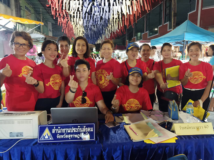 เมื่อวันที่ 17 มกราคม 2563 เวลา 15.00 น. นางมารศรี ใจรังษี ประกันสังคมจังหวัดสุราษฎร์ธานี และนางสาวอารีย์ การธิโร แรงงานจังหวัดสุราษฎร์ธานี พร้อมด้วยเจ้าหน้าที่สำนักงานประกันสังคม จัดกิจกรรมเทศกาลตรุษจีน ณ ตลาดนัดศาลเจ้า อ.เมือง จ.สุราษฎร์ธานี โดยมีการประชาสัมพันธ์และรับสมัครผู้ประกันตนมาตรา 40 ตามนโยบายของนายทศพล กฤตวงศ์วิมาน เลขาธิการสำนักงานประกันสังคม ที่ต้องการให้ดำเนินการในเรื่องนี้โดยใช้เครือข่ายต่างๆ เพื่อมอบความห่วงใยแก่แรงงานอิสระของไทยให้มีหลักประกันความมั่นคงในชีวิต (ซินเจียยู่อี่ ซินนี้ฮวดใช้) โดยมอบอั่งเปาสิทธิประโยชน์ดีๆ จากประกันสังคม มีผู้สมัครรายใหม่จำนวน 60 ราย รับชำระเงินสมทบ 16,000 บาท