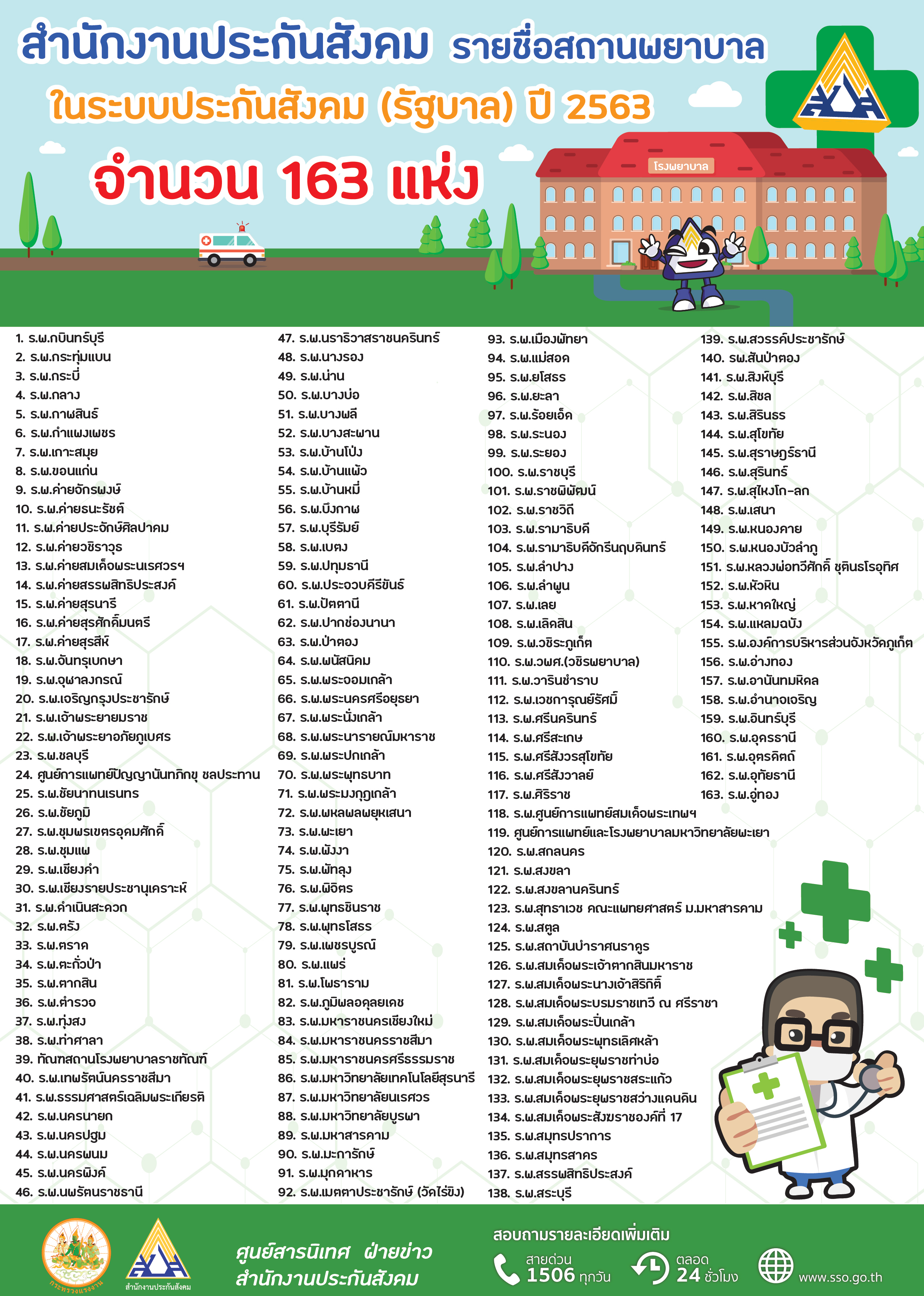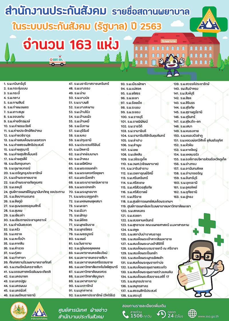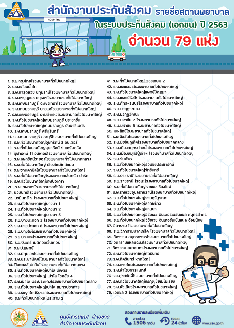 ด้านนายทศพล กฤตวงศ์วิมาน เลขาธิการสำนักงานประกันสังคม กระทรวงแรงงาน เปิดเผยว่า การที่สำนักงานประกันสังคมได้เปิดโอกาสให้ผู้ประกันตนสามารถขอเปลี่ยนสถานพยาบาลใหม่ได้ทุกๆ ปีๆ ละ 1 ครั้ง เพื่อเป็นการอำนวยความสะดวกให้กับผู้ประกันตนในการใช้บริการทางการแพทย์ ในกรณีมีเหตุจำเป็น และไม่ได้รับความสะดวก เช่น ย้ายที่พัก ย้ายสถานที่ทำงานใหม่ สำหรับในปี 2563 มีสถานพยาบาลที่เข้าร่วมโครงการประกันสังคมทั่วประเทศ จำนวน 242 แห่ง แบ่งเป็นโรงพยาบาลรัฐบาล 163 แห่ง สถานพยาบาลเอกชน 79 แห่ง โดยผู้ประกันตนสามารถตรวจสอบรายชื่อสถานพยาบาลที่เข้าร่วมโครงการประกันสังคมในปี 2563 ได้ที่เว็บไซต์สำนักงานประกันสังคม www.sso.go.th ที่สายด่วน 1506