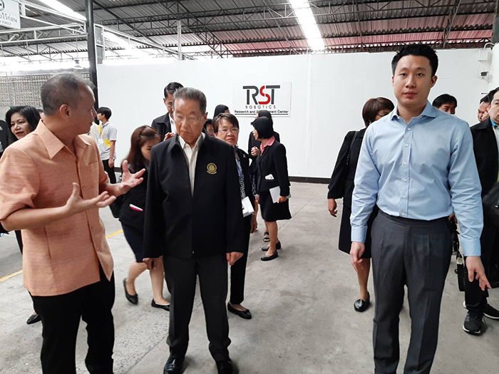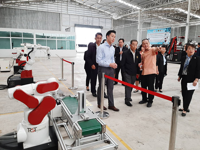 ม.ร.ว.จัตุมงคลฯ และคณะ ได้ตรวจเยี่ยมศูนย์การเรียนรู้หุ่นยนต์แขนกลและระบบอัตโนมัติซึ่งได้จัดตั้งขึ้นที่สถานประกอบการที่จังหวัดอุบลราชธานี ซึ่งศูนย์ดังกล่าวยังตอบโจทย์นโยบายไทยแลนด์ 4.0 ซึ่งเป็นโมเดลพัฒนาเศรษฐกิจของรัฐบาลปัจจุบัน โดย พล.อ.ประยุทธ์ จันทร์โอชา นายกรัฐมนตรี และ รมว.กลาโหม ที่มุ่งพัฒนาเศรษฐกิจที่ขับเคลื่อนด้วยนวัตกรรม ขณะเดียวกันผลิตภัณฑ์ที่ได้นั้นถือเป็นสินค้าที่ผลิตโดยสตาร์ทอัพคนไทย 100% นอกจากนี้ ยังได้เล็งเห็นปัญหาของธุรกิจระดับ SMEs รวมไปถึงสถานศึกษาที่ยังขาดแคลนผู้ที่มีความรู้ ความเข้าใจในการใช้หุ่นยนต์แขนกลอุตสาหกรรมอย่างแท้จริง หากผลิตออกจำหน่ายก็จะประสบปัญหาขาดแคลนบุคลากร ที่จะมาเป็นผู้ควบคุมเครื่องจักรหรือซ่อมบำรุงเบื้องต้น โดยมีกลุ่มหมายที่เป็นนักศึกษาอาชีวะ บุคลากรในโรงงานอุตสาหกรรมฯ มาฝึกอบรมใช้งานหุ่นยนต์ฯ และการซ่อมบำรุงเบื้องต้น