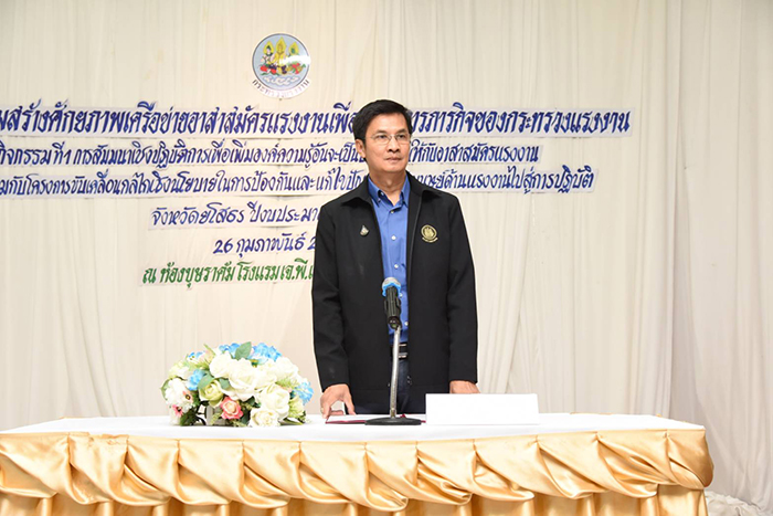 ที่ปรึกษารัฐมนตรีว่าการกระทรวงแรงงาน เป็นประธานเปิดโครงการเสริมสร้างศักยภาพเครือข่ายอาสาสมัครแรงงานเพื่อบูรณาการภารกิจของกระทรวงแรงงาน การสัมมนาเชิงปฏิบัติการเพื่อเพิ่มองค์ความรู้อันจะเป็นประโยชน์ให้กับอาสาสมัครแรงงาน บูรณาการร่วมกับโครงการขับเคลื่อนกลไกเชิงนโยบายในการป้องกันและแก้ไขปัญหาการค้ามนุษย์ด้านแรงงานไปสู่การปฏิบัติจังหวัดยโสธร ณ ห้องบุษราคัม โรงแรม เจ พี เอ็มเมอรัลด์ยโสธร อำเภอเมือง จังหวัดยโสธร