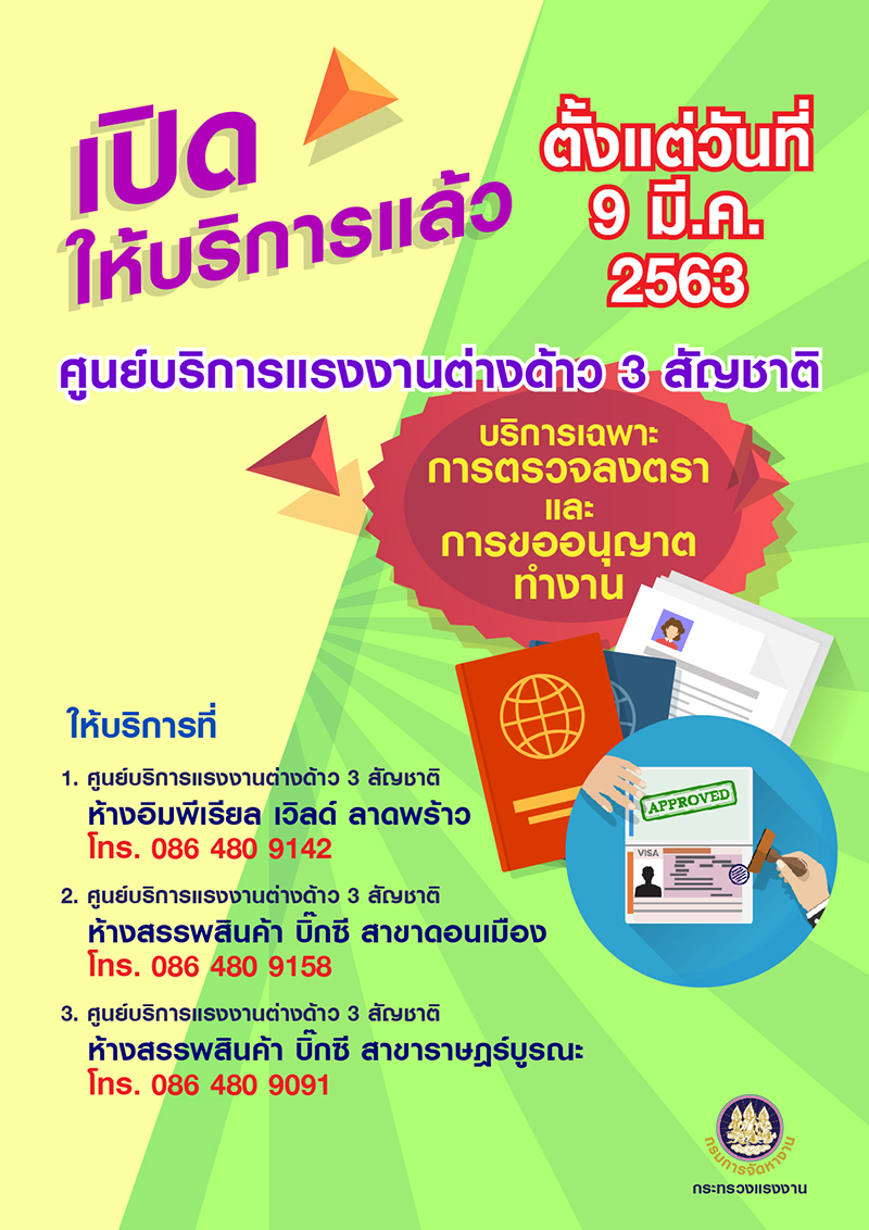 นายสุชาติ พรชัยวิเศษกุล อธิบดีกรมการจัดหางาน แจ้งว่า หม่อมราชวงศ์จัตุมงคล โสณกุล รัฐมนตรีว่าการกระทรวงแรงงาน กำชับให้กรมการจัดหางานประชาสัมพันธ์ให้นายจ้างรีบพาแรงงานต่างด้าวสัญชาติกัมพูชา ลาว และเมียนมา ไปดำเนินการขออนุญาตทำงานและขออยู่ต่อในราชอาณาจักร ซึ่งเหลือเวลาอีก 22 วัน ที่จะปิดศูนย์ จึงย้ำให้เร่งดำเนินการภายในกำหนดระยะเวลา ทั้งนี้ กรมการจัดหางานได้เปิดศูนย์ให้บริการแรงงานต่างด้าว 3 สัญชาติของสำนักงานตรวจคนเข้าเมือง เพิ่มเติมอีก 3 แห่ง เพื่อรองรับนายจ้าง/ สถานประกอบการที่จะมาใช้บริการจำนวนมาก ในช่วงที่ใกล้จะสิ้นสุดระยะเวลาการขอใบอนุญาตทำงาน ได้แก่ 1. ห้างสรรพสินค้า อิมพีเรียลเวิลด์ ลาดพร้าว 2. ห้างสรรพสินค้า บิ๊กซี สาขาดอนเมือง (สะพานใหม่) 3. ห้างสรรพสินค้าบิ๊กซี สาขาราษฎร์บูรณะ เพื่อให้บริการเพิ่มเติมเกี่ยวกับการตรวจลงตราวีซ่าของสำนักงานตรวจคนเข้าเมืองและขอใบอนุญาตงาน (ตท.2) ของกรมการจัดหางาน โดยจะเปิดให้บริการตั้งแต่วันที่ 9 มีนาคม 2563 – 31 มีนาคม 2563 สำหรับศูนย์ที่เปิดบริการเพิ่ม 3 ศูนย์ จะไม่มีหน่วยงานของกรมการปกครอง แต่นายจ้าง/สถานประกอบการ สามารถดำเนินการติดต่อหน่วยงานกรมการปกครองเพื่อทำบัตรชมพูให้แรงงานต่างด้าวได้ตั้งแต่วันที่ 1 เมษายน 2563 – 30 มิถุนายน 2563 ซึ่งการนัดหมายเข้ารับบริการในศูนย์ฯทั้ง 3 แห่งที่ตั้งใหม่ สามารถนัดหมายผ่านระบบออนไลน์ทาง e-workpermit.doe.go.th ได้เช่นเดียวกับ 4 ศูนย์ฯ