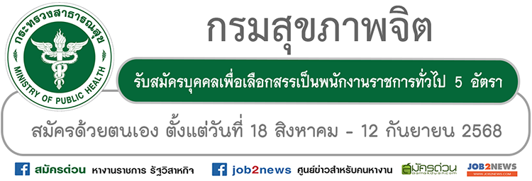 ประกาศกรมสุขภาพจิต เรื่อง รับสมัครบุคคลเพื่อเลือกสรรเป็นพนักงานราชการทั่วไป ในตำแหน่งวิศวกรโยธา นักวิชาการคอมพิวเตอร์ นักทรัพยากรบุคคล นักวิชาการโสตทัศนศึกษา และนายช่างเทคนิค สถาบันจิตเวชศาสตร์สมเด็จเจ้าพระยา โดยมีรายละเอียดดังต่อไปนี้