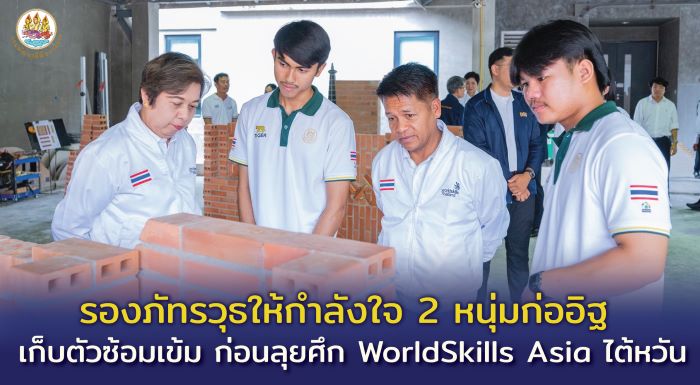 รองอธิบดี กล่าวต่อว่า วันนี้ได้เข้าเยี่ยมและให้กำลังใจ นายศุภกฤต แสงธูป (น้องกล้า) สังกัดวิทยาลัยเทคนิคลพบุรี และนายชุติภาส ขวัญจ่า (น้องฟิล์ม) สังกัดวิทยาลัยเทคนิคสว่างแดนดิน ทั้งนี้ ได้รับเกียรติจากคุณธีระยุทธ พันธ์มีเชาว์ Construction Technology Excellence Director บริษัท ผลิตภัณฑ์และวัตถุก่อสร้าง จำกัด ประธานสาขาก่ออิฐ และนายโอฬาร จันทร์ภู่ สมาคมธุรกิจรับสร้างบ้านให้การต้อนรับอย่างอบอุ่น สำหรับน้องทั้ง 2 คนนี้ จะมี 1 คน จะได้เป็นตัวแทนเยาวชนไทยไปแข่งขันฝีมือแรงงานเอเชีย ครั้งที่ 3 ณ ไทเป ไต้หวัน ซึ่งได้เก็บตัวฝึกซ้อมที่สถาบันฝึกอบรมเทคโนโลยีผนังและพื้น ตราเสือ Tiger Wall and Floor Technology Center จังหวัดสระบุรี สถาบันดังกล่าว เป็นผู้ดูแลและฝึกสอนตลอดระยะเวลาในการฝึกซ้อม จากการพูดคุยกับน้อง ๆ ทั้ง 2 คน ผู้เชี่ยวชาญ และผู้ฝึกสอนได้ทำการสอนตั้งแต่ขั้นพื้นฐาน การออกแบบต่าง ๆ การฝึกแกะแบบ การวางแผนการก่อ ไปจนถึงการก่ออิฐเป็นลวดลายต่าง ๆ ตามแบบ ปัจจุบันมีการฝึกซ้อมกว่า 20 โมดูล มีความมั่นใจ และพร้อมกับการแข่งขันในครั้งนี้