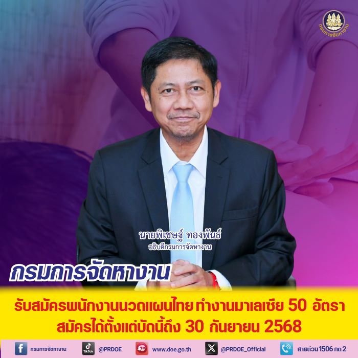 นายพิเชษฐ์ ทองพันธ์ อธิบดีกรมการจัดหางาน เปิดเผยว่า กระทรวงแรงงาน โดยกรมการจัดหางานเปิดรับสมัครคนหางานเพื่อไปทำงานกับนายจ้างบริษัท VYV Wellness Retreat Sdn Bhd ประเทศมาเลเซีย ซึ่งประกอบกิจการร้านนวด ในตำแหน่งพนักงานนวดแผนไทย จำนวน 50 อัตรา โดยค่าจ้างสามารถเลือกทางใดทางหนึ่ง ได้แก่ แบบเงินเดือนประจำ จำนวน 3,300 ริงกิตมาเลเซียต่อเดือน หรือประมาณ 24,800 บาท (ขึ้นอยู่กับอัตราแลกเปลี่ยน) แบบค่าคอมมิชชั่นตามจำนวนชั่วโมงทำงาน ชั่วโมงที่ 1–160 คิดอัตราชั่วโมงละ 22 ริงกิต ตั้งแต่ชั่วโมงที่ 161 เป็นต้นไป คิดอัตราชั่วโมงละ 25 ริงกิต กำหนดเวลาทำงาน 7.5 ชั่วโมงต่อวัน ทำงาน 6 วันต่อสัปดาห์ ระยะเวลาจ้างงาน 2 ปี โดยนายจ้างจะจัดหาที่พัก อุปกรณ์ประกอบอาหาร จ่ายค่าโดยสารเครื่องบินไป-กลับ เมื่อทำงานครบสัญญาจ้าง พร้อมประกันคุ้มครองการเบิกค่ารักษาพยาบาล และประกันสุขภาพตามที่รัฐบาลประเทศมาเลเซียกำหนด ผู้สนใจสามารถยื่นใบสมัครได้ที่เว็บไซต์ toea.doe.go.th ได้ตั้งแต่บัดนี้ถึง 30 กันยายน 2568 ตลอด 24 ชั่วโมง ไม่เว้นวันหยุดราชการ