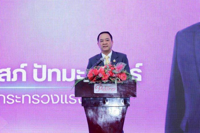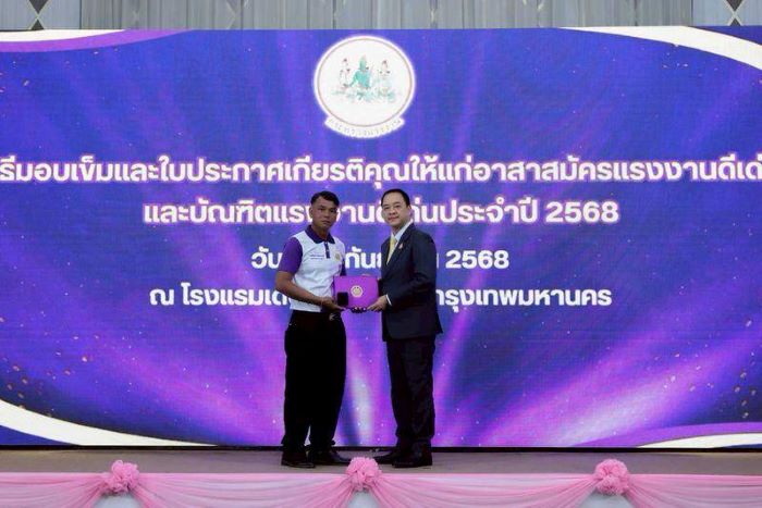 นายสมาสภ์ ปัทมะสุคนธ์ รองปลัดกระทรวงแรงงาน มอบเข็ม และใบประกาศเกียรติคุณให้แก่อาสาสมัครแรงงานดีเด่น และบัณฑิตแรงงานดีเด่น ประจำปี พ.ศ. 2568 โดยมี นายสิบหมื่นชัย โพธิสินธุ์ ผู้ตรวจราชการกระทรวงแรงงาน นายเกริกไกร นาสมยนต์ ที่ปรึกษากฎหมาย นายศักดินาถ สนธิศักดิ์โยธิน ผู้ช่วยปลัดกระทรวงแรงงาน และผู้บริหารกระทรวงแรงงาน ร่วมด้วย ณ ห้องแกรนด์พาลาสโซ ชั้น 7 โรงแรมพาลาสโซ ถนนรัชดาภิเษก เขตดินแดง กรุงเทพมหานคร