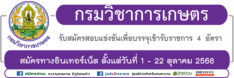 ผู้ประสงค์จะสมัครเข้ารับการคัดเลือก สมัครได้ทางอินเทอร์เน็ต ตั้งแต่วันที่ 1 - 22 ตุลาคม พ.ศ. 2568 ตลอด 24 ชั่วโมง ไม่เว้นวันหยุดราชการ ที่เว็บไซต์ https://doa.thaijobjob.com อ่านรายละเอียดที่ไฟล์ประกาศรับสมัคร