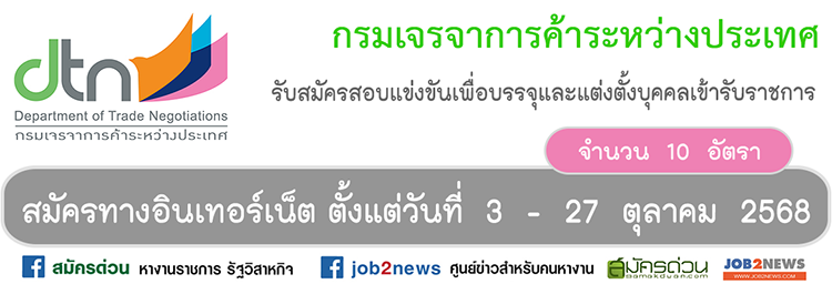 ผู้ประสงค์จะสมัครเข้ารับการคัดเลือก สมัครได้ทางอินเทอร์เน็ต ตั้งแต่วันที่ 3 - 27 ตุลาคม 2568 ตลอด 24 ชั่วโมง ไม่เว้นวันหยุดราชการ ที่เว็บไซต์ https://dtn.thaijobjob.com/ อ่านรายละเอียดที่ไฟล์ประกาศรับสมัคร