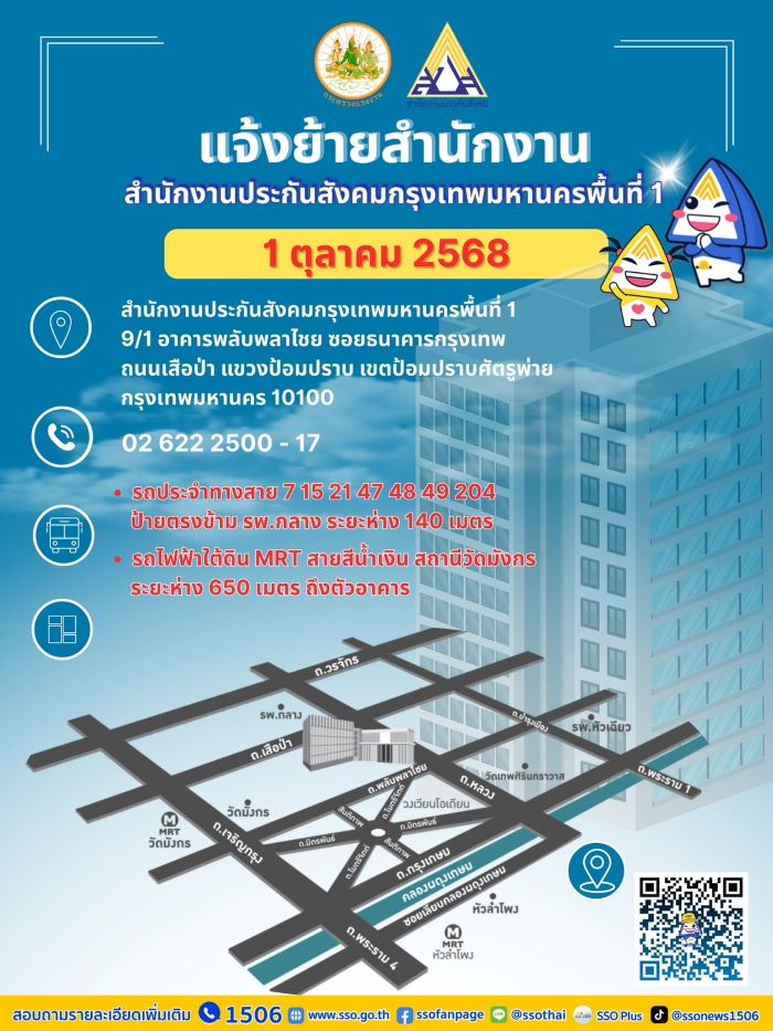 นางสาวบุปผา เรืองสุด เลขาธิการสำนักงานประกันสังคม แจ้งว่าสำนักประกันสังคมกรุงเทพมหานครพื้นที่ 1 ประกาศแจ้งย้ายที่ทำการใหม่อย่างเป็นทางการ โดยมีผลตั้งแต่วันที่ 1 ตุลาคม 2568 เป็นต้นไป เพื่อรองรับการให้บริการที่สะดวก รวดเร็ว และมีประสิทธิภาพมากยิ่งขึ้นแก่ผู้ประกันตนและประชาชนทั่วไป โดยสำนักงานประกันสังคมกรุงเทพมหานครพื้นที่ 1 แห่งใหม่นี้ ตั้งอยู่เลขที่ 9/1 อาคารพลับพลาไชย ชั้น 5 ซอยธนาคารกรุงเทพ ถนนเสือป่า แขวงป้อมปราบ เขตป้อมปราบศัตรูพ่าย กรุงเทพมหานคร 10100 หมายเลขโทรศัพท์ 02 – 622 – 2500 – 17