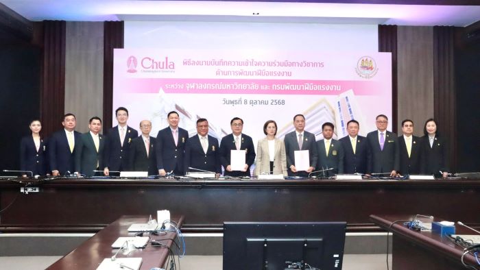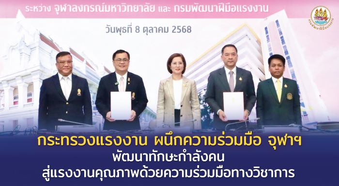 กระทรวงแรงงาน โดยกรมพัฒนาฝีมือแรงงาน ร่วมกับจุฬาลงกรณ์มหาวิทยาลัย ลงนามบันทึกความเข้าใจความร่วมมือทางวิชาการด้านการพัฒนาฝีมือแรงงาน เพื่อยกระดับศักยภาพกำลังคนของประเทศให้สอดคล้องกับความต้องการของตลาดแรงงานในยุคเทคโนโลยีเปลี่ยนผ่าน เมื่อวันพุธที่ 8 ตุลาคม 2568 ณ ห้อง 202 อาคารจามจุรี 4 จุฬาลงกรณ์มหาวิทยาลัย