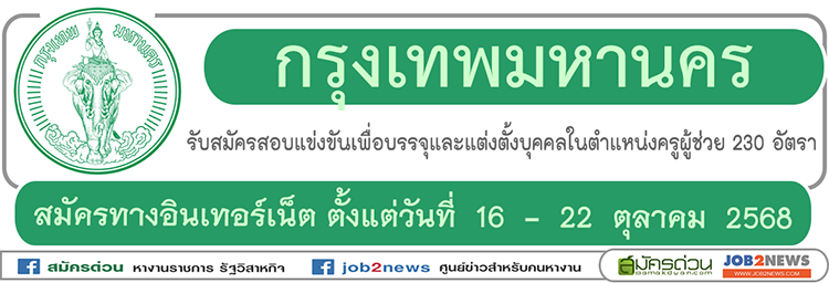 ผู้ประสงค์จะสมัครเข้ารับการคัดเลือก สมัครได้ทางอินเทอร์เน็ต ตั้งแต่วันที่ 16 - 22 ตุลาคม 2568 ตลอด 24 ชั่วโมง ไม่เว้นวันหยุดราชการ ที่เว็บไซต์ https://teacherbkk.thaijobjob.com อ่านรายละเอียดที่ไฟล์ประกาศรับสมัคร