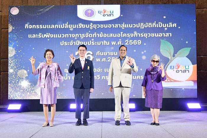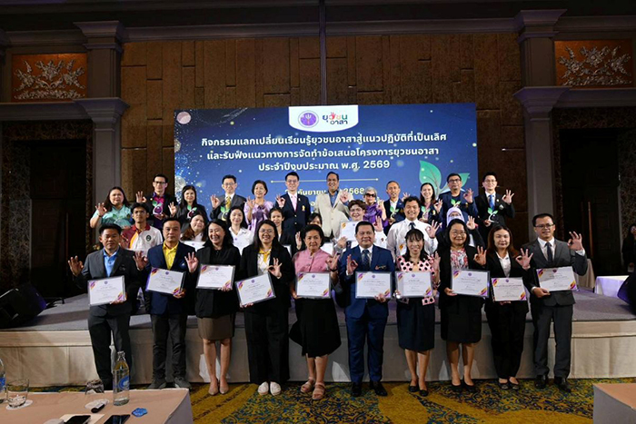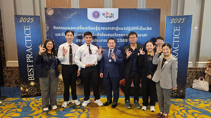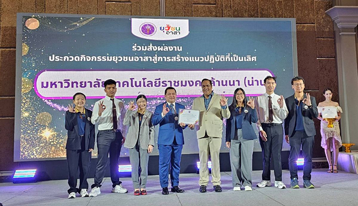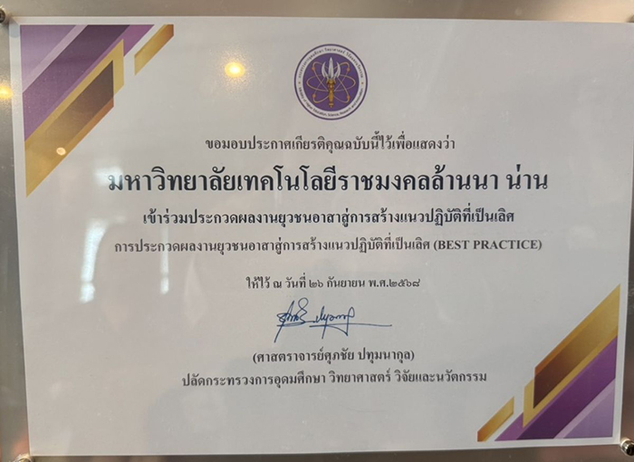 ณ ห้อง Jubilee Ballroom ชั้น 11 โรงแรมเดอะ เบอร์เคลีย์ ประตูน้ำกรุงเทพฯ ผศ.ดร.วิโรจน์ มงคลเทพ ผู้อำนวยการสำนักงานบริหารมหาวิทยาลัยเทคโนโลยีราชมงคลล้านนา น่าน นำทีมอาจารย์ ผศ.ดร.นงนุช เกตุ้ย , ผศ.วรวิทย์ ฝั้นคำอ้าย , ผศ.ขนิษฐา หอมจันทร์ , อ.ศิริลักษณ์ แก้วศิริรุ่ง , อ.อธิกร สงวนศรี และนักศึกษามหาวิทยาลัย เข้ารับมอบประกาศนียบัตรร่วมส่งผลงานการประกวด “ยุวชนอาสาสู่การสร้างแนวปฏิบัติที่เป็นเลิศ (Best Practice)” ในกิจกรรมแลกเปลี่ยนเรียนรู้ยุวชนอาสาสู่แนวปฏิบัติที่เป็นเลิศและรับฟังแนวทางการจัดทำข้อเสนอโครงการยุวชนอาสา ประจำปีงบประมาณ พ.ศ. 2569
