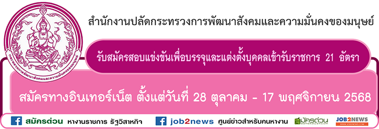 ประกาศสำนักงานปลัดกระทรวงการพัฒนาสังคมและความมั่นคงของมนุษย์ เรื่อง รับสมัครสอบแข่งขันเพื่อบรรจุและแต่งตั้งบุคคลเข้ารับราชการ โดยมีรายละเอียดดังต่อไปนี้