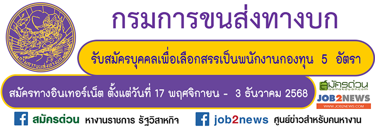 ประกาศกรมการขนส่งทางบก เรื่อง รับสมัครบุคคลเพื่อเลือกสรรเป็นพนักงานกองทุนเพื่อความปลอดภัยในการใช้รถใช้ถนน ในตำแหน่งนักจัดการกองทุน เจ้าพนักงานกองทุน เจ้าพนักงานการเงินและบัญชี และเจ้าหน้าที่กองทุน โดยมีรายละเอียดดังต่อไปนี้