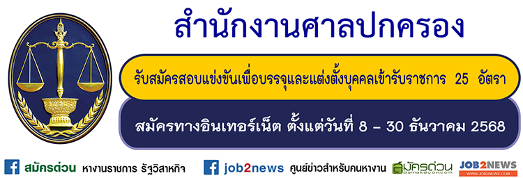 ผู้ประสงค์จะสมัครสอบ สมัครได้ทางอินเทอร์เน็ต ตั้งแต่วันที่ 8 - 30 ธันวาคม 2568 ตลอด 24 ชั่วโมง ไม่เว้นวันหยุดราชการ ที่เว็บไซต์ https://admincourt.thaijobjob.com/ อ่านรายละเอียดที่ไฟล์ประกาศรับสมัคร