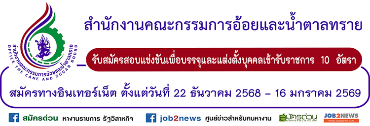 ประกาศสำนักงานคณะกรรมการอ้อยและน้ำตาลทราย เรื่อง รับสมัครสอบแข่งขันเพื่อบรรจุและแต่งตั้งบุคคลเข้ารับราชการ โดยมีรายละเอียดดังต่อไปนี้