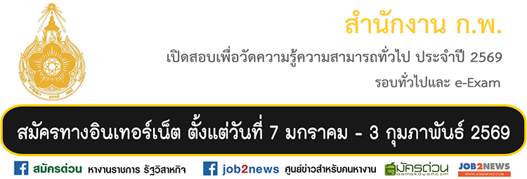 ประกาศสำนักงาน ก.พ. เรื่อง รับสมัครสอบเพื่อวัดความรู้ความสามารถทั่วไปด้วยระบบอิเล็กทรอนิกส์ (e-Exam) และ ระบบกระดาษ (Paper&Pencil)ประจำปี 2569