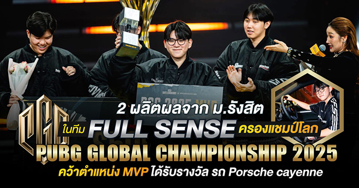 นักกีฬาอีสปอร์ต นายชนม์ชนก ชาญเกษม (Belmoth) และนายธนดล จุติสุขสันติ์ (Thanad0l) 2 ผลิตผลจากมหาวิทยาลัยรังสิต สมาชิกทีม FULL SENSE ครองแชมป์โลก PUBG GLOBAL CHAMPIONSHIP 2025 & คว้าตำแหน่ง MVP ได้รับรางวัล รถ Porsche cayenne มาครอง