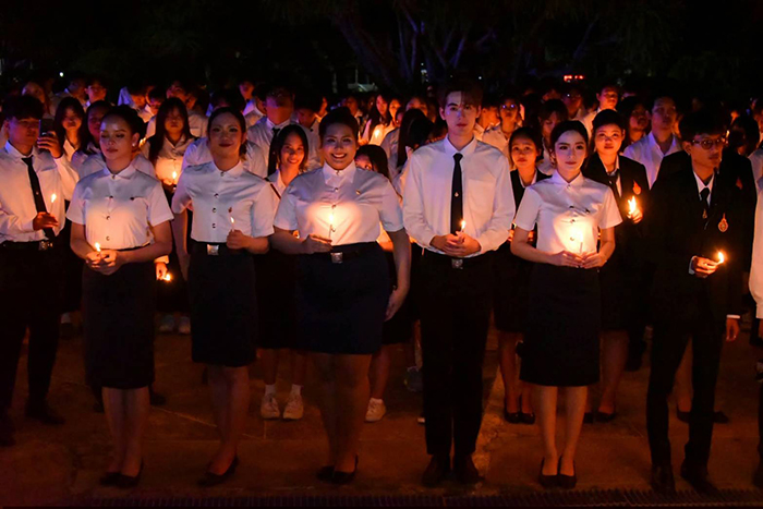 จากนั้นเป็น การบรรเลงวงดนตรีสากลในบทเพลงพระราชนิพนธ์ อันทรงคุณค่า โดยคณะศิลปกรรมศาสตร์ เพื่อร่วมน้อมรำลึกในพระอัจฉริยภาพ และพระมหากรุณาธิคุณผ่านท่วงทำนองแห่งเสียงดนตรี พร้อมด้วยการสร้างประวัติศาสตร์ความอาลัยผ่าน การกล่าวสุนทรพจน์ 4 ภาษา ประกอบด้วยภาษาจีน ภาษาญี่ปุ่น ภาษาอังกฤษ และภาษาไทย ตามลำดับ โดยคณะศิลปศาสตร์ เพื่อประกาศพระเกียรติคุณให้ขจรขจายสู่สากล กระทั่งเข้าสู่ช่วงพิธีการหลักในเวลา 19.10 น.