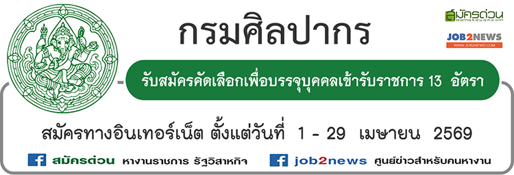 ประกาศกรมศิลปากร เรื่อง รับสมัครคัดเลือกเพื่อบรรจุบุคคลเข้ารับราชการ สังกัดกรมศิลปากร ครั้งที่ 1/2569 โดยมีรายละเอียดดังต่อไปนี้