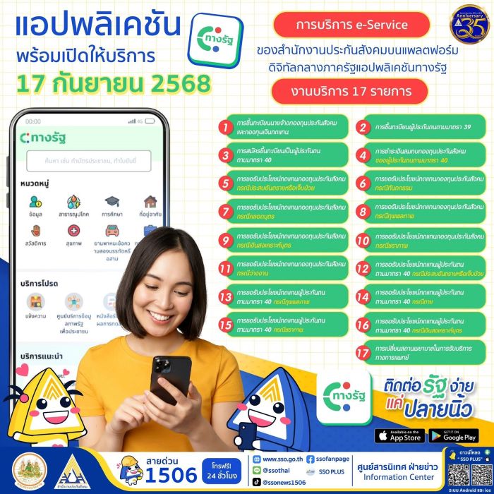 สำนักงานประกันสังคม ร่วมกับแอปพลิเคชัน “ทางรัฐ” เพื่ออำนวยความสะดวกให้แก่ผู้ประกันตนและนายจ้าง สามารถเข้าถึงบริการด้านประกันสังคมได้อย่างครบวงจรผ่านช่องทางดิจิทัล ตอบโจทย์ไลฟ์สไตล์ยุคใหม่ที่ต้องการความรวดเร็วและเข้าถึงได้ทุกที่ทุกเวลาตลอด 24 ชั่วโมง
