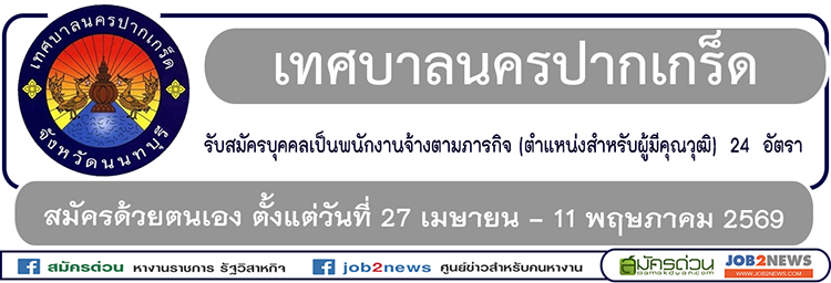 ประกาศเทศบาลนครปากเกร็ด เรื่อง รับสมัครบุคคลเพื่อการสรรหาและเลือกสรรเป็นพนักงานจ้างตามภารกิจ (ตำแหน่ง