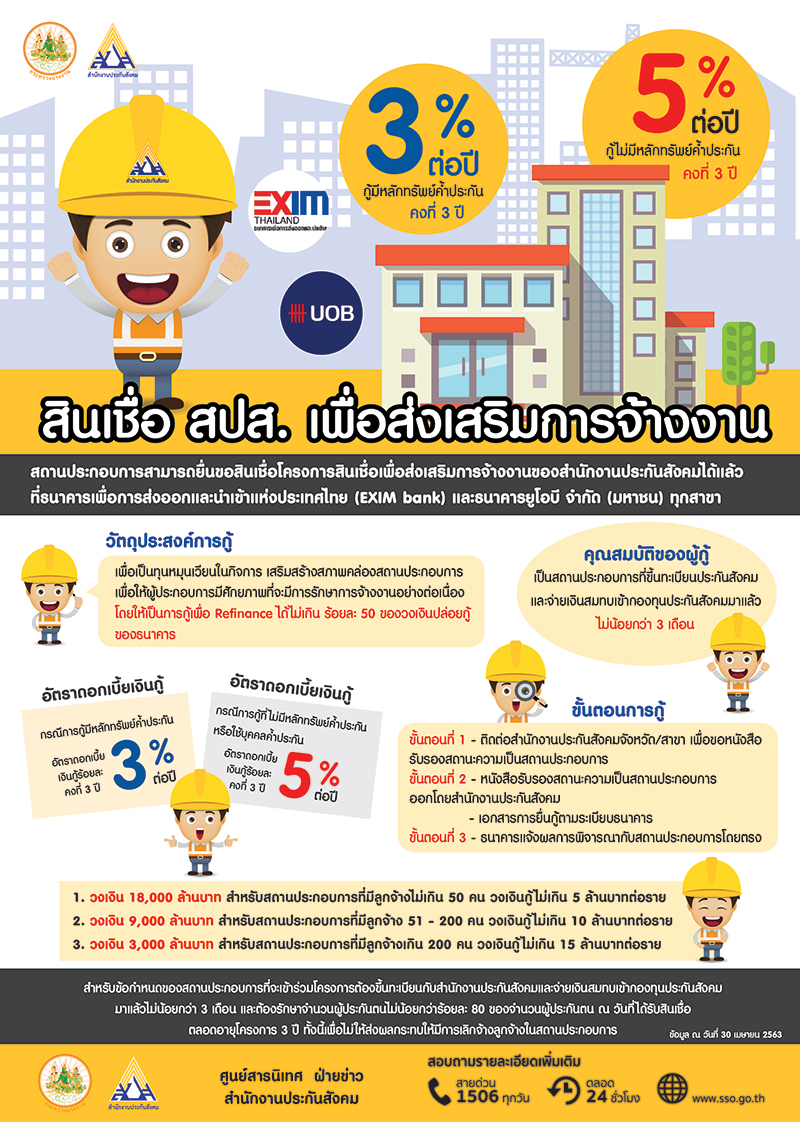 นางพิศมัย นิธิไพบูลย์ หัวหน้าผู้ตรวจราชการกรม สำนักงานประกันสังคม ในฐานะโฆษกสำนักงานประกันสังคม เปิดเผยว่า จากการที่รัฐบาล และกระทรวงแรงงาน ได้มีมาตรการเพื่อช่วยเหลือผู้ประกอบการ ที่ได้รับผลกระทบจากสภาวะเศรษฐกิจจากโรคโควิด-19 ให้สามารถรักษาการจ้างงานให้ผู้ประกันตนมีงานทำต่อเนื่องและอยู่ในระบบประกันสังคม สำนักงานประกันสังคมได้มีโครงการสินเชื่อเพื่อส่งเสริมการจ้างงาน วงเงินไม่เกิน 30,000 ล้านบาท เพื่อให้สถานประกอบการกู้เป็นทุนหมุนเวียนในกิจการเสริมสภาพคล่อง ให้มีศักยภาพ มีการจ้างงานอย่างต่อเนื่อง โดยเป็นการกู้เพื่อ Refinance ได้ไม่เกินร้อยละ 50 ของวงเงินปล่อยกู้ของแต่ละธนาคารที่เข้าร่วมโครงการฯ ซึ่ง ณ ขณะนี้มีธนาคารเข้าร่วมโครงการสินเชื่อเพื่อส่งเสริมการจ้างงานแล้ว จำนวน 2 ธนาคาร ได้แก่ ธนาคารเพื่อการส่งออกและนำเข้าแห่งประเทศไทย (EXIM BANK) วงเงินสินเชื่อ เพื่อกู้ในโครงการฯ จำนวน 2,000 ล้านบาท และล่าสุดมีธนาคารเข้าร่วมโครงการสินเชื่อฯ เพิ่มเติมได้แก่ ธนาคารยูโอบี จำกัด (มหาชน) วงเงินสินเชื่อเพิ่มเติมอีก 2,000 ล้านบาท ทั้งนี้ มีระยะเวลาการยื่นคำขอกู้ตั้งแต่เริ่มโครงการจนถึง 31 ธันวาคม 2563 หรือจนกว่าวงเงินโครงการจะหมด โดยวงเงินสินเชื่อได้มีการจัดสรร ดังนี้
