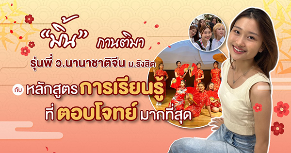 การเรียนภาษาจีนที่วิทยาลัยนานาชาติ มหาวิทยาลัยรังสิต เป็นมากกว่าการได้เรียนรู้ด้านภาษา เพราะที่นี่ หลักสูตรการเรียนการสอนเน้นการเรียนรู้ด้านบริหารธุรกิจ เพื่อเตรียมความพร้อมให้กับนักศึกษาสามารถเตรียมตัวสู่โอกาสใหม่ทางธุรกิจในตลาดโลกได้ เช่นเดียวกับเหตุผลในการเลือกเรียนของเธอคนนี้ มิ้น - กานติมา รุ่นพี่จากวิทยาลัยนานาชาติจีน เธอบอกว่าอยากเรียนอะไรที่มากกว่าภาษา เรียนแล้วจะต้องเอาไปใช้ได้จริงในอนาคตด้วย