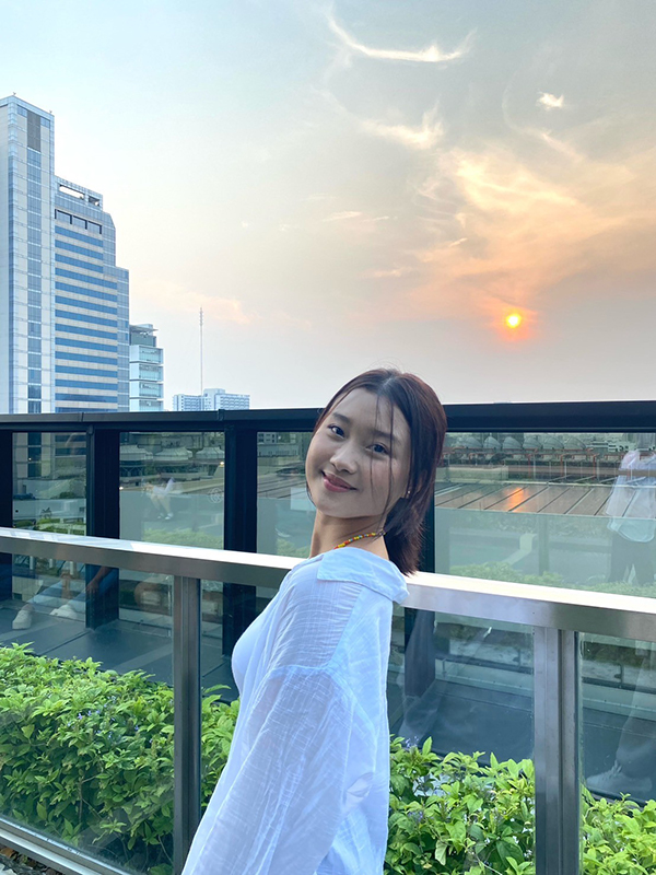 “เรียนภาษาจีนมาช่วง ม.ปลายค่ะ ก็เลยอยากต่อยอด เพราะว่าถ้าเว้นช่วงไปกลัวจะลืมเลือนค่ะ ภาษาถ้าใช้บ่อยๆ ได้ฝึกฝน ก็จะใช้มันได้ออกมาอย่างธรรมชาติค่ะ จึงมองหาหลักสูตรในระดับมหาวิทยาลัยที่ใช้ภาษาจีนในการเรียน และตรงกับคณะที่อยากเรียนด้วย มิ้นอยากเรียนบริหารธุรกิจค่ะ ตอนนั้นโจทย์นี้ค่อนข้างหามหาวิทยาลัยได้ยาก แต่ AI คงได้ยินเสียงเราค่ะ เปิดเฟซบุ๊กมาก็เจอเพจของวิทยาลัยนานาชาติจีน รีบคลิกดูข้อมูล ตรงใจและน่าสนใจมากๆ เลยค่ะ จึงเริ่มทักเข้าไปพูดคุยสอบถาม ได้ข้อมูลมาเพิ่มด้วยว่ามีโครงการ 1+2+1 ได้ไปเรียนที่มหาวิทยาลัยที่จีนด้วย บอกกับที่บ้านเลยว่าเลือกแล้วค่ะ ไม่ดูที่อื่นแล้วค่ะ ตอนนี้มิ้นเรียนที่นี่มาสามปีแล้วค่ะ เวลาเดินผ่านไปรวดเร็วมาก ความประทับใจตั้งแต่วันแรกๆ ยังจดจำได้เป็นอย่างดี ที่สำคัญมหาวิทยาลัยเอกชนแห่งนี้ Nice ไปหมดทุกเรื่องเลยค่ะ บรรยากาศในชั้นเรียนก็อบอุ่น อาจจะต้องกระตือรือร้นมากหน่อย เพราะเราเป็นนักศึกษาไทย เมื่อต้องเรียนรวมกับนักศึกษาจีน และอาจารย์จีน แต่ก็คุ้มค่าค่ะ เพราะถ้าเราไม่กล้าแสดงออก ไม่พูด ไม่ฟัง เราก็จะเก่งช้าลงไปค่ะ ในห้องเรียนจะมีอะไรให้ท้าทายตลอดทั้งเนื้อหา ได้ทำกิจกรรมร่วมกันเพื่อนคนจีน สนุกต่างกันออกไป ได้แลกเปลี่ยนเรียนรู้วัฒนธรรมของกันและกัน ทำงานกลุ่มด้วยกันใช้ภาษาจีนพูดคุยกันสนุกฉ่ำมาก และยังกิจกรรมที่เหล่าซือพาออกไปเยี่ยมชมงาน เรียนรู้เกี่ยวกับอุตสาหกรรม ธุรกิจต่างๆ ที่สอดคล้องกับการเรียนดีมากเลย ได้สัมผัสประสบการณ์จริงๆ สนุกมากๆ ค่ะ”