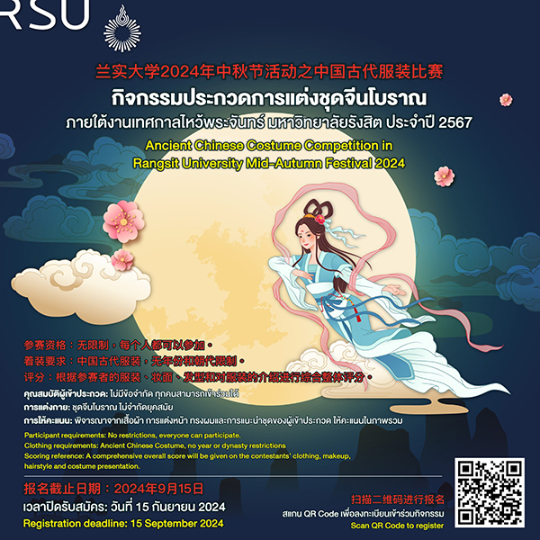 สถาบันจีน-ไทยแห่งมหาวิทยาลัยรังสิต ขอเชิญผู้ที่สนใจเข้าร่วมการประกวดการแต่งกายชุดจีนโบราณ ในงานไหว้พระจันทร์ ประจำปี 2567 ซึ่งจะจัดขึ้นระหว่างวันที่ 16 – 18 กันยายน 2567 เวลา 16.30 น. - 20.00 น. ณ อาคารอาทิตย์ อุไรรัตน์ (อาคาร 1) มหาวิทยาลัยรังสิต ผู้ที่สนใจสามารถสมัครเข้าร่วมการประกวดได้ตั้งแต่วันนี้ – 15 กันยายน 2567 โดยสามารถเข้าร่วมการประกวดได้ทุกเพศ ทุกวัย ไม่มีข้อจำกัด พร้อมการแต่งกายชุดจีนโบราณ ไม่จำกัดยุคสมัย ทั้งนี้ สามารถสแกน QR CODE เพื่อลงทะเบียนเข้าร่วมกิจกรรม หรือสามารถสอบถามรายละเอียดเพิ่มเติมได้ที่ สถาบันจีน-ไทยแห่งมหาวิทยาลัยรังสิต โทร. 0-2997-2200 ต่อ 6515