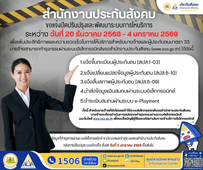 นางสาวกาญจนา พูลแก้ว เลขาธิการสำนักงานประกันสังคม เปิดเผยว่า สำนักงานประกันสังคมได้ดำเนินการพัฒนาระบบการให้บริการรูปแบบใหม่ โดยยกระดับระบบงานสู่ SSO Core ซึ่งเป็นระบบกลางที่มีความทันสมัย รองรับการให้บริการอย่างครบวงจร และสามารถบูรณาการข้อมูลได้อย่างมีประสิทธิภาพ เพื่ออำนวยความสะดวกให้แก่นายจ้างและผู้ประกันตน ทั้งนี้ สำนักงานประกันสังคมขอแจ้ง ปิดปรับปรุงและพัฒนาระบบการให้บริการ ระหว่างวันที่ 20 ธันวาคม 2568 ถึงวันที่ 4 มกราคม 2569 ซึ่งในช่วงเวลาดังกล่าว นายจ้างยังสามารถดำเนินธุรกรรมที่จำเป็นผ่าน ระบบบริการอิเล็กทรอนิกส์ของสำนักงานประกันสังคม (www.sso.go.th) ได้ตามปกติ ดังนี้