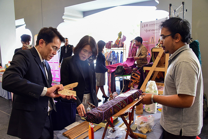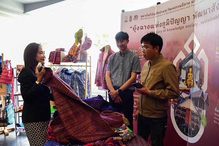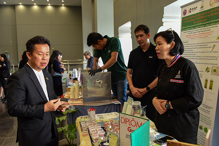 ในโอกาสนี้ คณะผู้เข้าร่วมงานได้เยี่ยมชมการจัดแสดงนิทรรศการผลงานวิจัยและนวัตกรรมที่โดดเด่นของมหาวิทยาลัยมหาสารคาม เช่น การพัฒนาต้นแบบผำ GAP, เครื่องปรุงรสทดแทนวาซาบิ, ผลิตภัณฑ์จากมันแกว, ผลิตภัณฑ์ฟาร์มแคร์ (PharmCare), ผลงานจากสถาบันวิจัยศิลปะและวัฒนธรรมอีสาน และ Innovative Product ต่าง ๆ