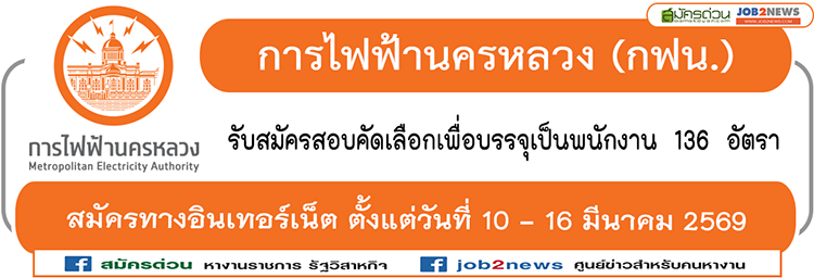 สมัครออนไลน์ทางเว็บไซต์เท่านั้น ตั้งแต่วันอังคารที่ 10 ถึงวันจันทร์ที่ 16 มีนาคม 2569 ตลอด 24 ชั่วโมง ไม่เว้นวันหยุดราชการ เข้าเว็บไซต์ https://www.mea.or.th (ประกาศรับสมัครงาน)
