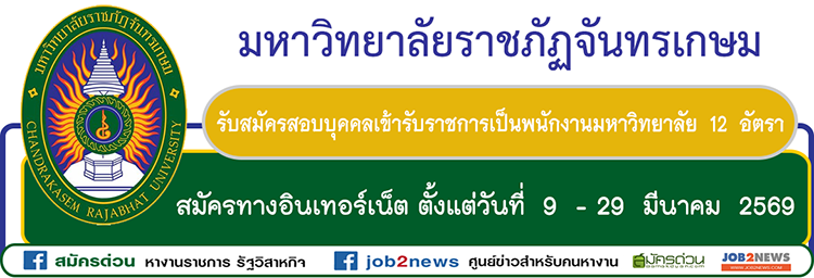 บุคคล http://teacher.chandra.ac.th/emp/index.php และเว็บไซต์มหาวิทยาลัย http://www.chandra.ac.th ระหว่างวันที่ 9 - 29 มีนาคม 2569 ไม่เว้นวันหยุดราชการ ยกเว้นวันที่ 29 มีนาคม 2569 ระบบจะปิดรับสมัคร เวลา 16.30 น. สอบถามเพิ่มเติมโทร. 0 2942 5800 หรือ 0 2942 6800 ต่อ 1148 หรือ Facebook: กองบริหารงานบุคคล มหาวิทยาลัยราชภัฏจันทรเกษม หรือ อีเมล:
