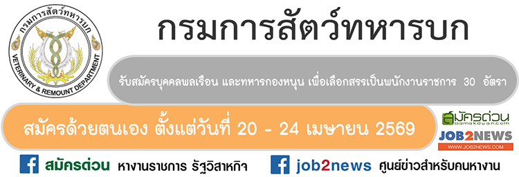 ประกาศกรมการสัตว์ทหารบก เรื่อง รับสมัครบุคคลพลเรือน และทหารกองหนุน เพื่อเลือกสรรเป็นพนักงานราชการ กรมการสัตว์ทหารบก ประจำปีงบประมาณ 2569 โดยมีรายละเอียดดังต่อไปนี้