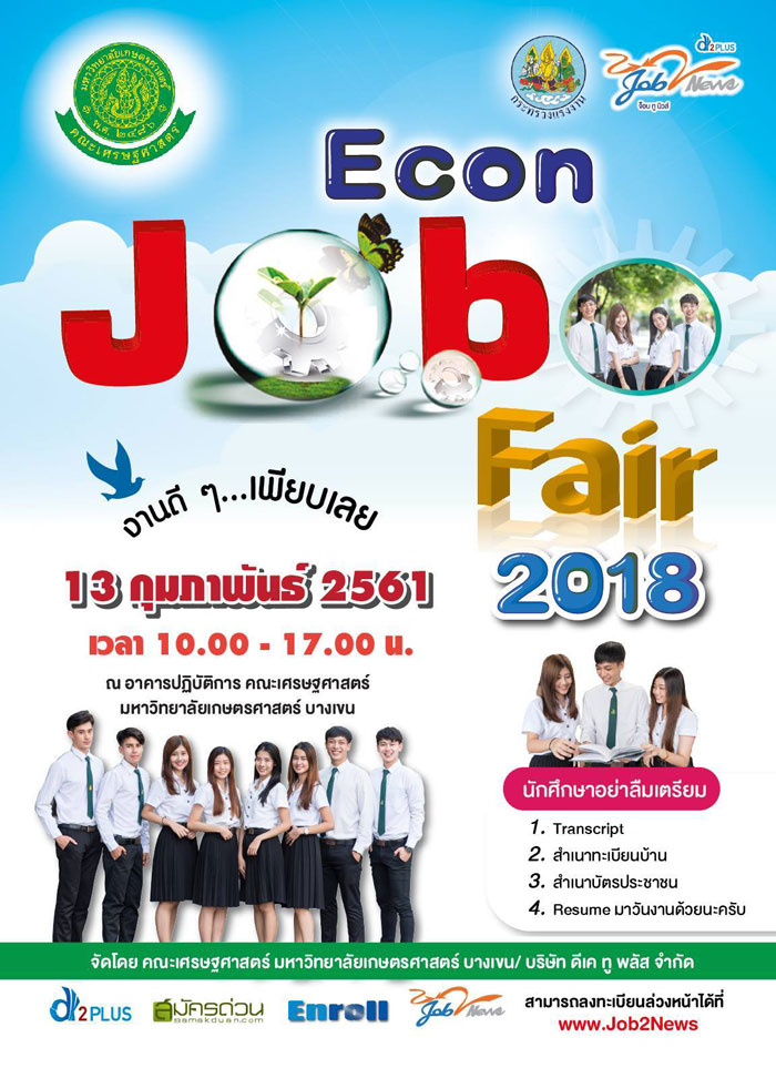 ขอเชิญร่วมงาน Econ Job Fair 2018งานดีๆ ...เพียบเลยวันที่ 13 กุมภาพันธ์ 2561 เวลา 10.00 - 17.00 น. ณ อาคารปฏิบัติการ คณะเศรษฐศาสตร์ มหาวิทยาลัยเกษตรศาสตร์ บางเขน