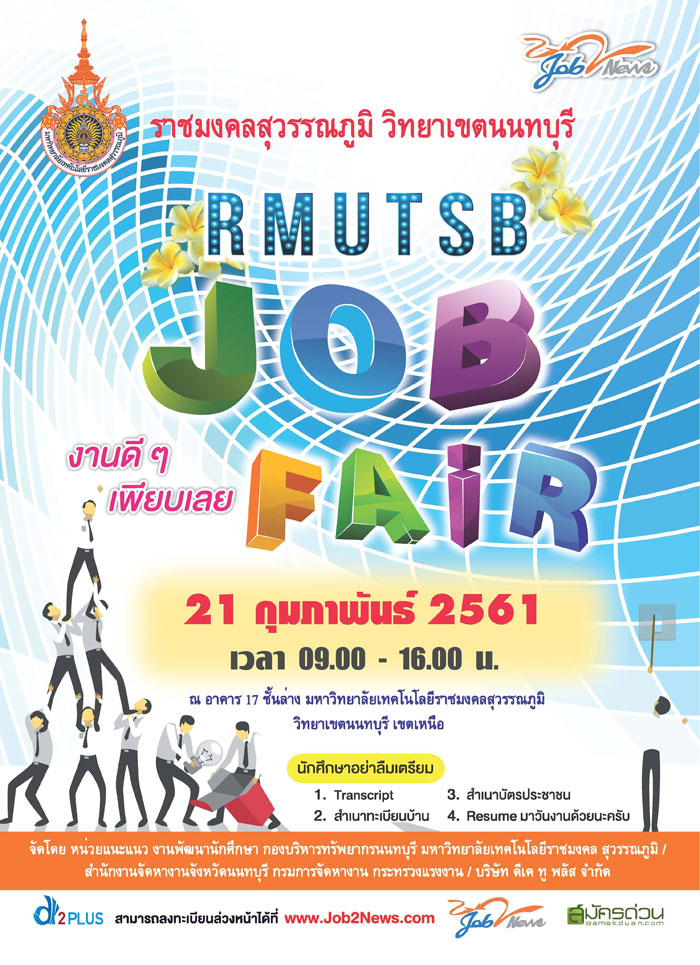 ราชมงคลสุวรรณภูมิ วิทยาเขตนนทบุรีRMUTSB JOB FAIRวันที่ 21 กุมภาพันธ์ 2561 เวลา 09.00 - 16.00 น.ณ อาคาร 17 ชั้นล่าง มหาวิทยาลัยเทคโนโลยีราชมงคลสุวรรณภูมิ วิทยาเขตนนทบุรี เขตเหนือ